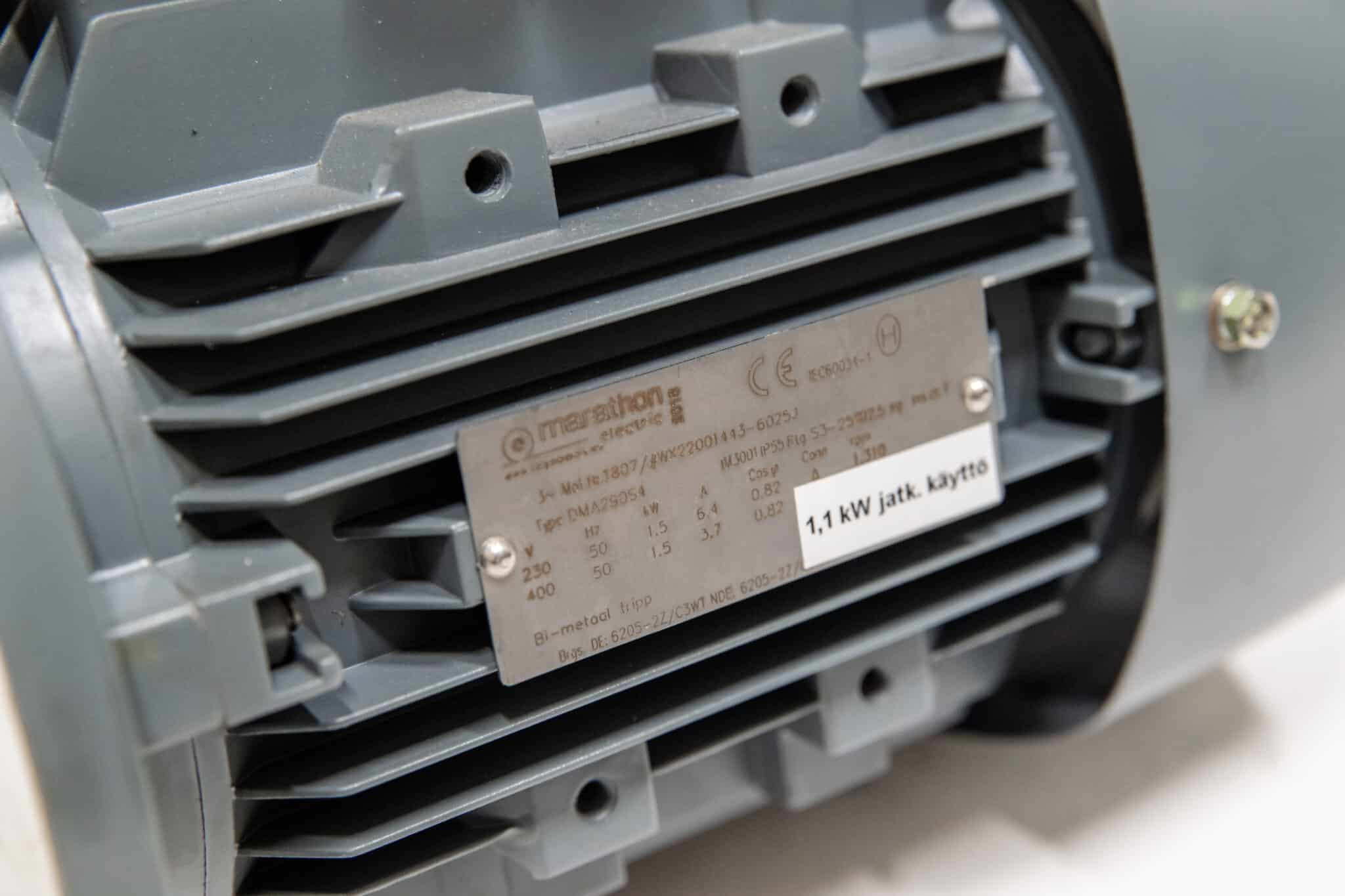 jatkuvaan 1,1 kW käyttöön (S1). Tämä tekee siitä erittäin kestävyysvarman vaihtoehdon kohteisiin, joissa moottorin on pyörittävä taukoamatta.